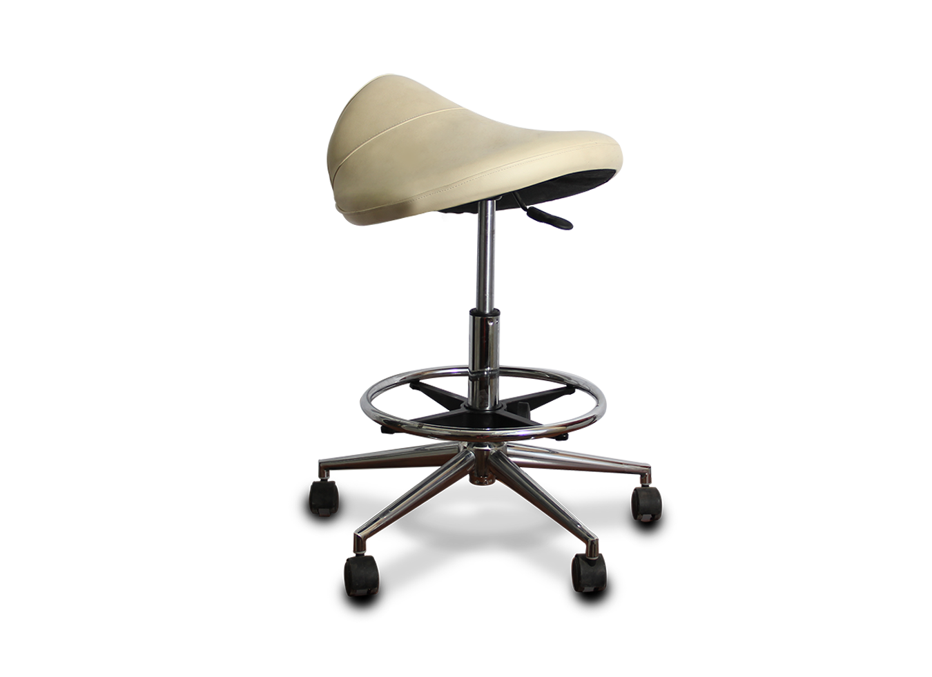 כיסא אוכף מקצועי ונוח עם חישוק תמיכה לרגליים, מתאים במיוחד למטפלים הדורשים תנועה חופשית ונוחות בזמן טיפול ממושך.